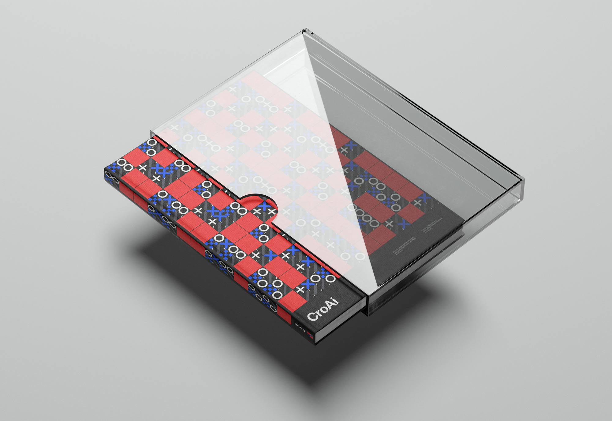 A modular grid inspired by the Croatian checkerboard scales from minimal units to complex compositions. The palette links national heritage with a contemporary, technological feel.